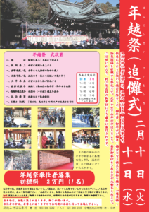 2月10日(火)11日(水)に行われる筑波山神社の年越祭(追儺式)に参加される方を募集しております。年越祭は、古くは旧暦の初満月に合わせて行われておりました。現在は新暦の10日11日に斎行しております。